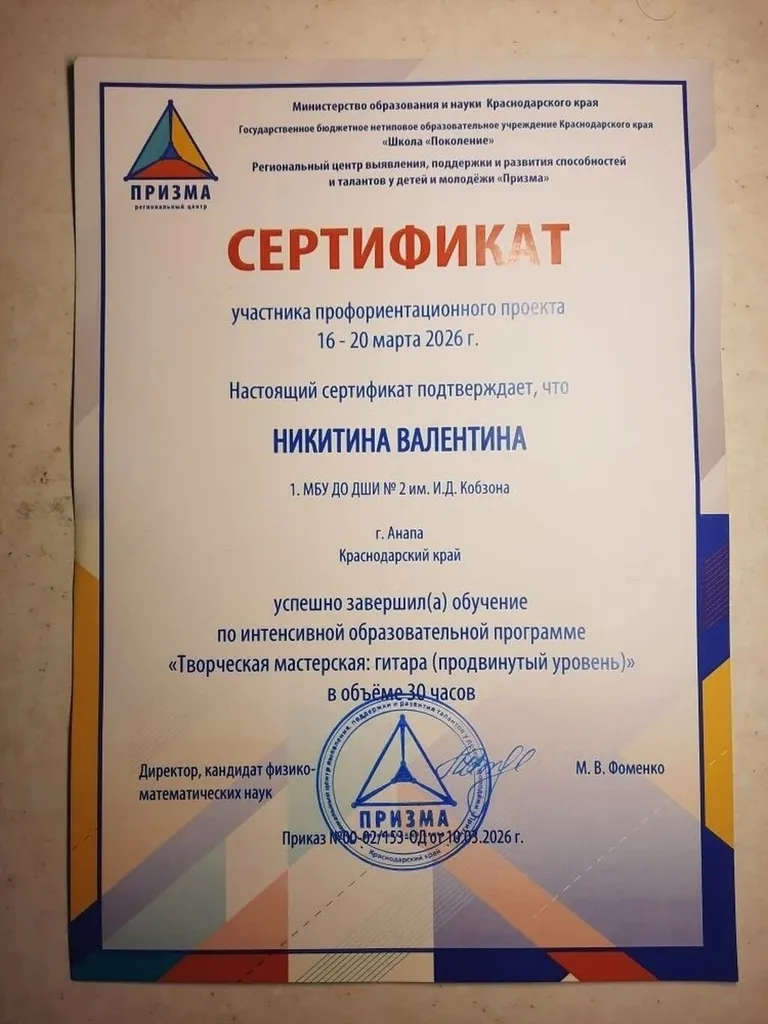 Учащаяся методического объединения "Музыкальное искусство" (гитара) Детской школы искусств 2 имени народного артиста СССР Иосифа Давыдовича Кобзона Валентина Никитина приняла участие в профильной смене «Творческая мастерская» в региональном центре «Призма» (г. Краснодар). Мероприятие представляло собой образовательный интенсив для одаренных детей.
